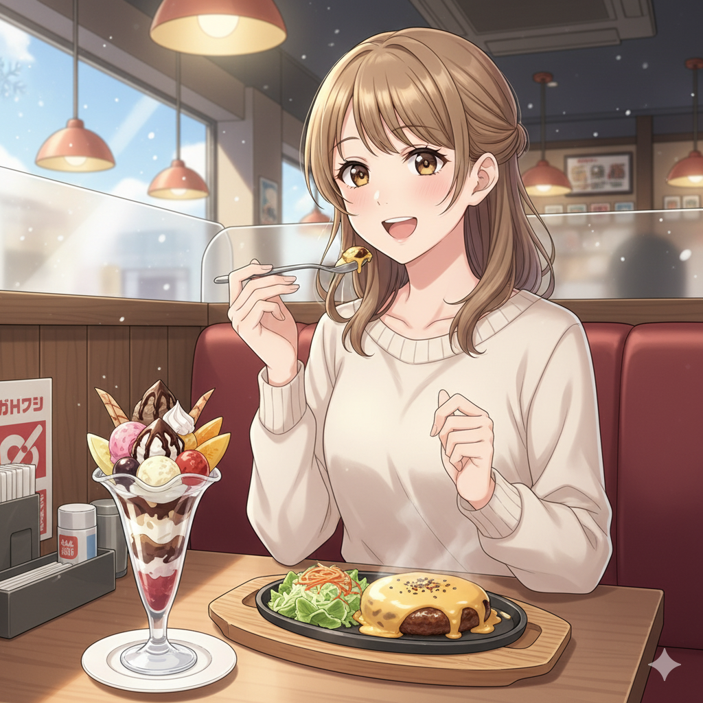 北海道のびっくりドンキーで日本人22歳OLがチーズバーグディッシュとパフェを食べている アニメ風