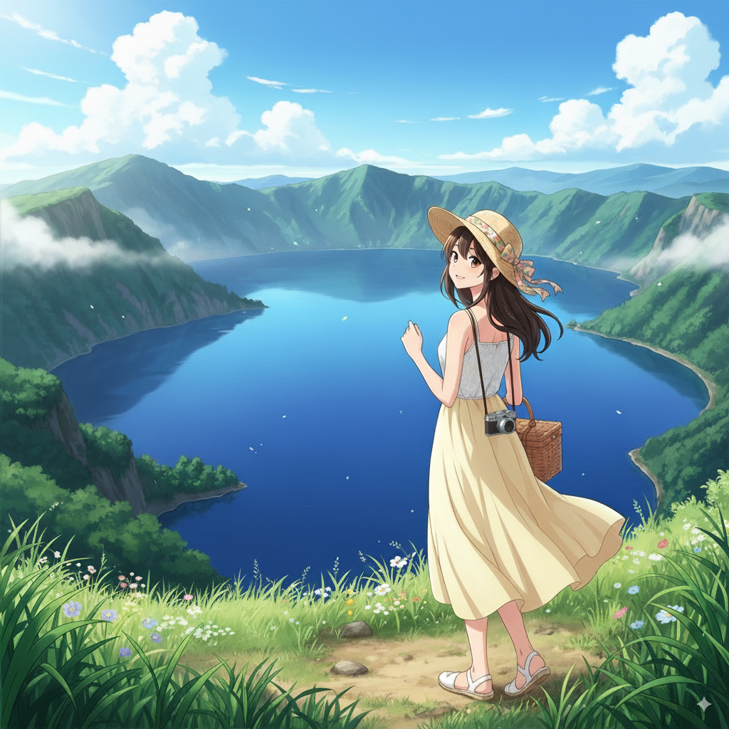 ⬆️命令文:日本人23歳女性が摩周湖(弟子屈町)でバカンスしている 服装は涼しそう アニメ風