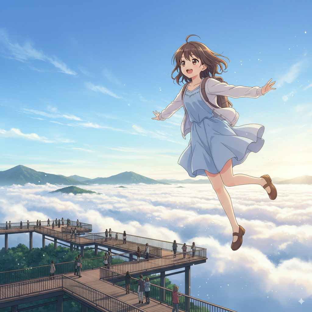 ⬆️命令文:日本人14歳女性が雲海テラス(トマム)を楽しそうに飛行している アニメ風