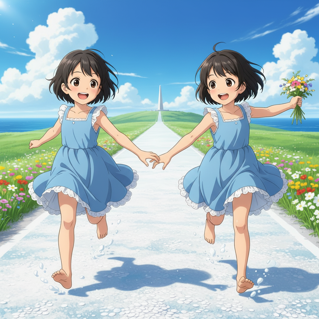 ⬆️命令文:日本人7歳女性2人が宗谷岬・白い道を裸足で歩きながらはしゃいでいる アニメ風