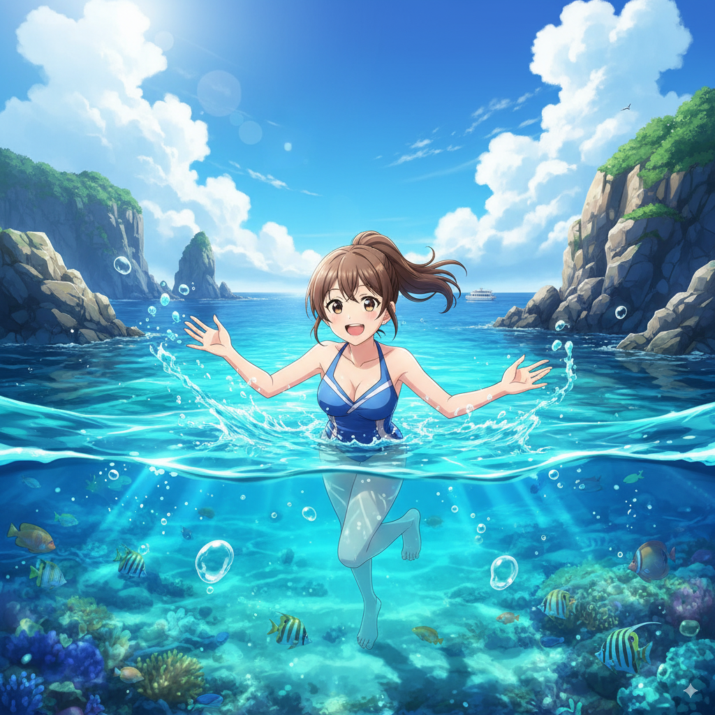 日本人29歳女性が積丹ブルー(積丹町)で楽しそうに泳いでいる アニメ風
