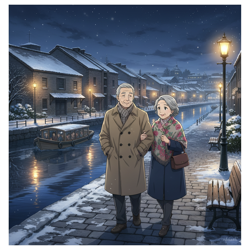 日本人70代夫婦が小樽運河(小樽市)を観光してゆったりしている アニメ風
