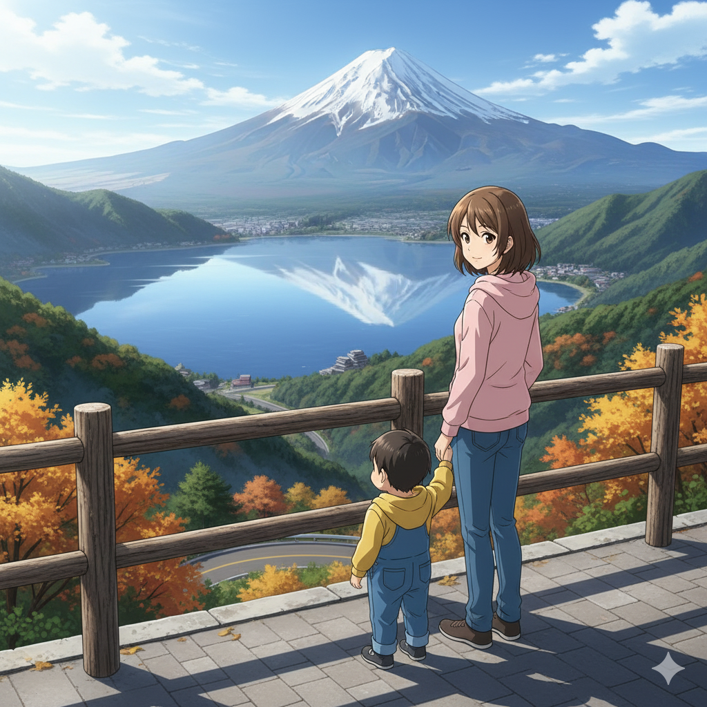 日本人22歳親子連れ 山中湖パノラマ台 アニメ風