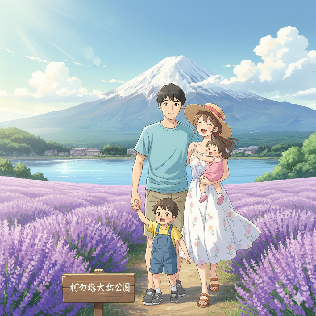日本人30歳夫婦子供2人 河口湖大石公園(ラベンダー)アニメ風