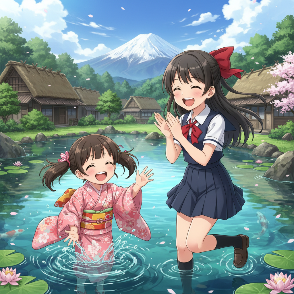 日本人5歳女性と日本人10才女性が忍野八海で楽しそうに遊んでいる アニメ風
