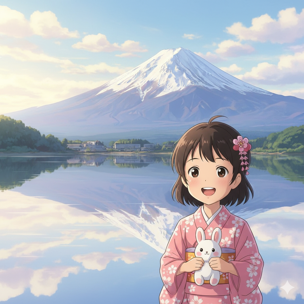 日本人3歳女性が笑顔 精進湖からの逆さ富士 アニメ風