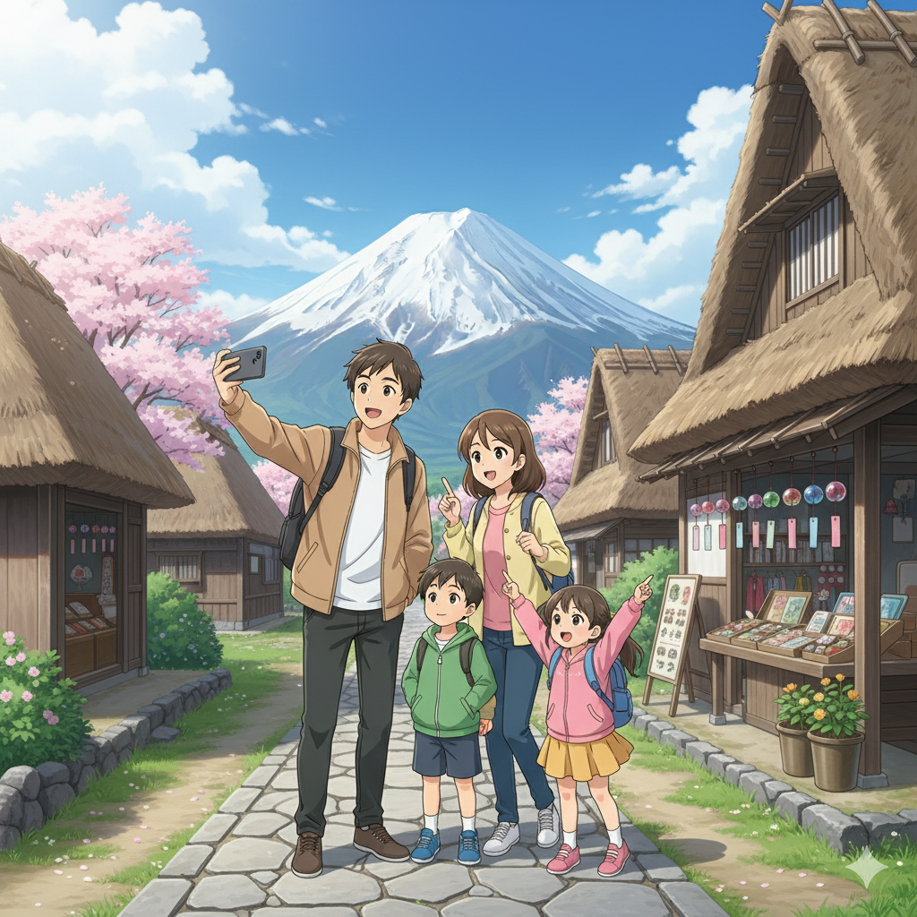 日本人30代4人家族が西湖いやしの里根場を堪能している アニメ風