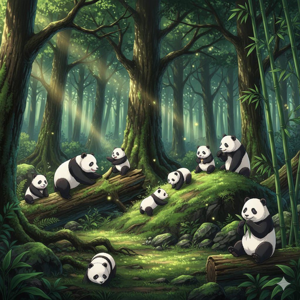 青木ヶ原樹海で子パンダ5頭と大人パンダ5頭が遊んでいる アニメ風