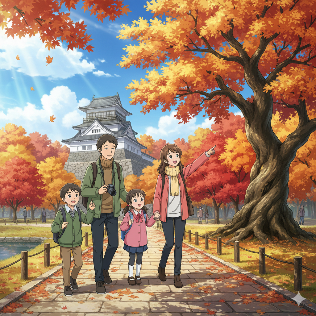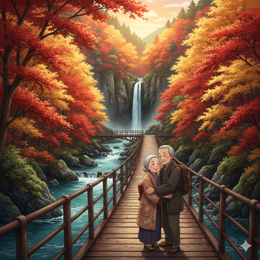 日本人80代夫婦 抱返り渓谷 紅葉 アニメ風