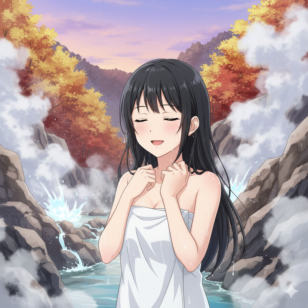 小安峡大噴湯のお湯を浴びている日本人19歳女性 アニメ風