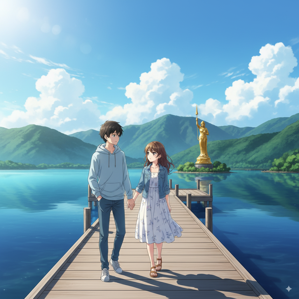 日本人20歳カップルが田沢湖でデートしている アニメ風
