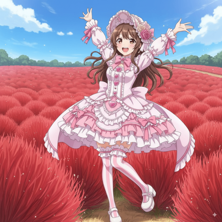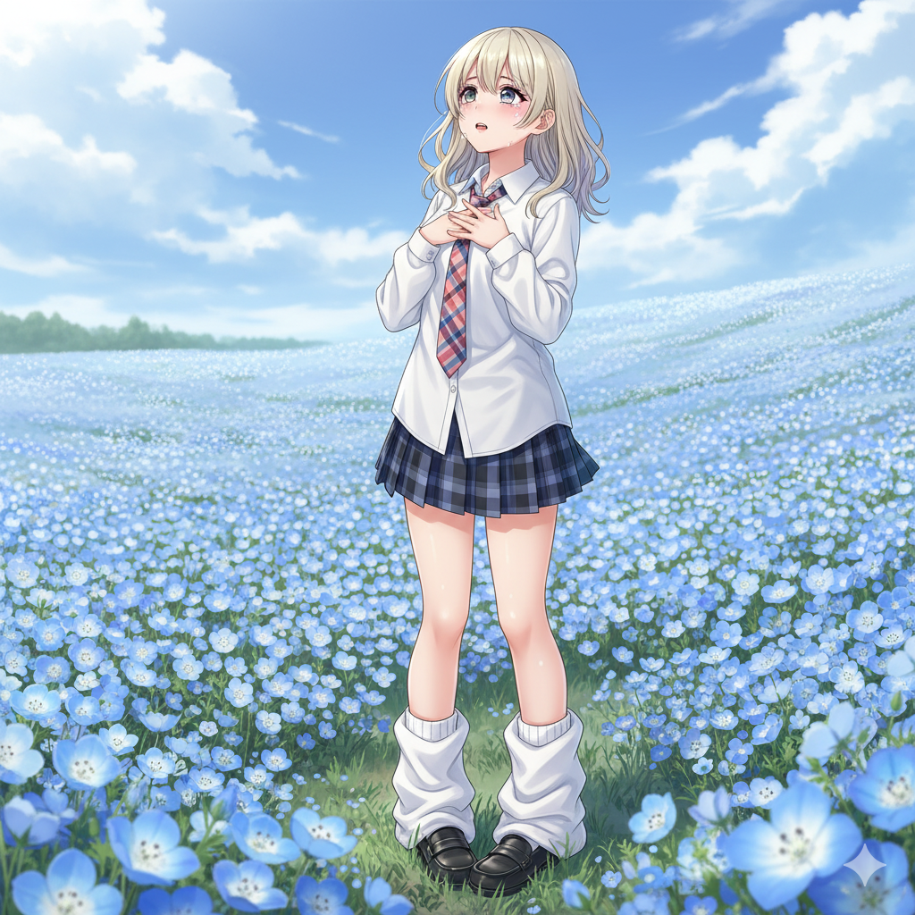 日本人17歳白ギャル女子校生がルーズソックスで国営ひたち海浜公園のネモフィラをみて感動している アニメ風