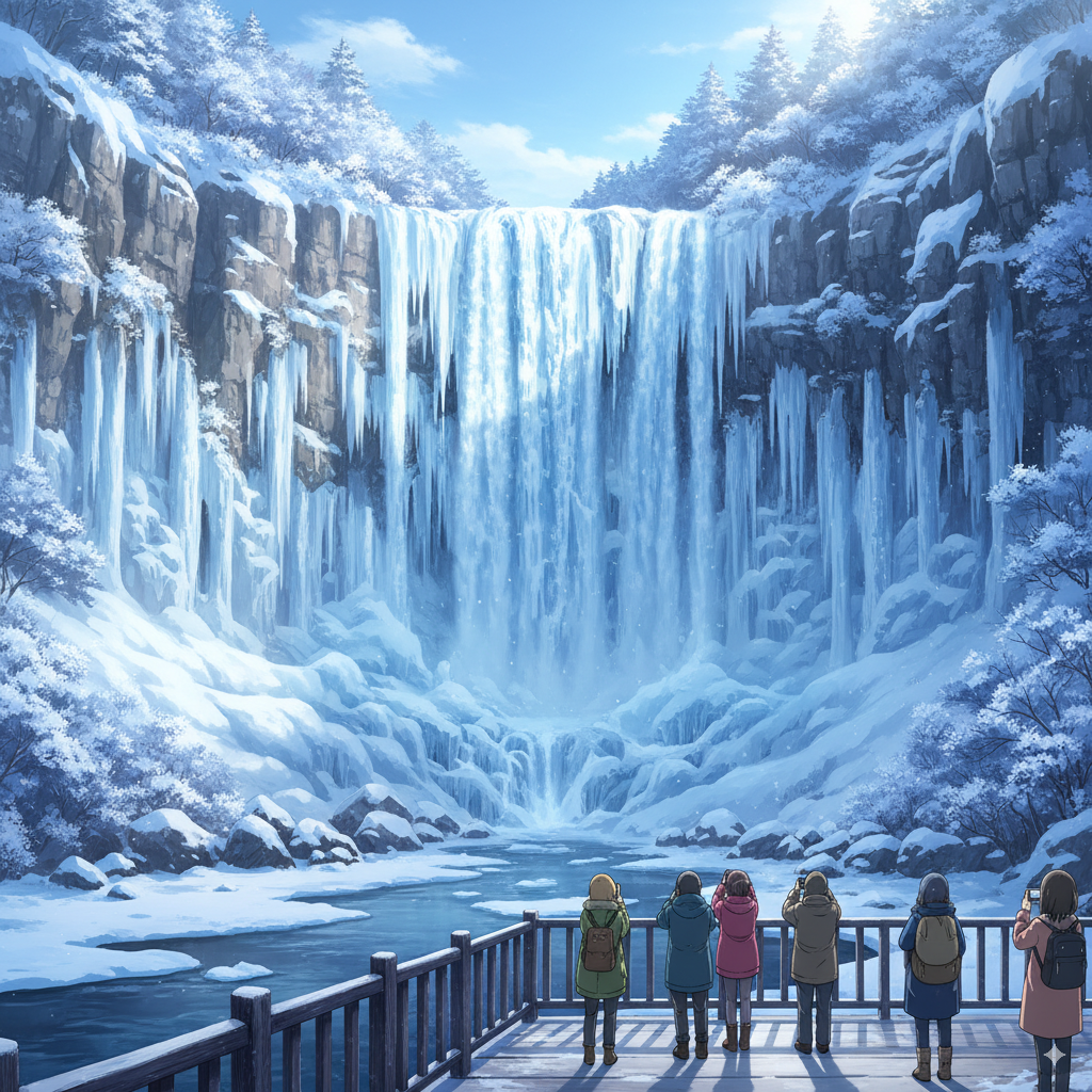袋田の滝(日本三名瀑)が見事に凍っている アニメ風