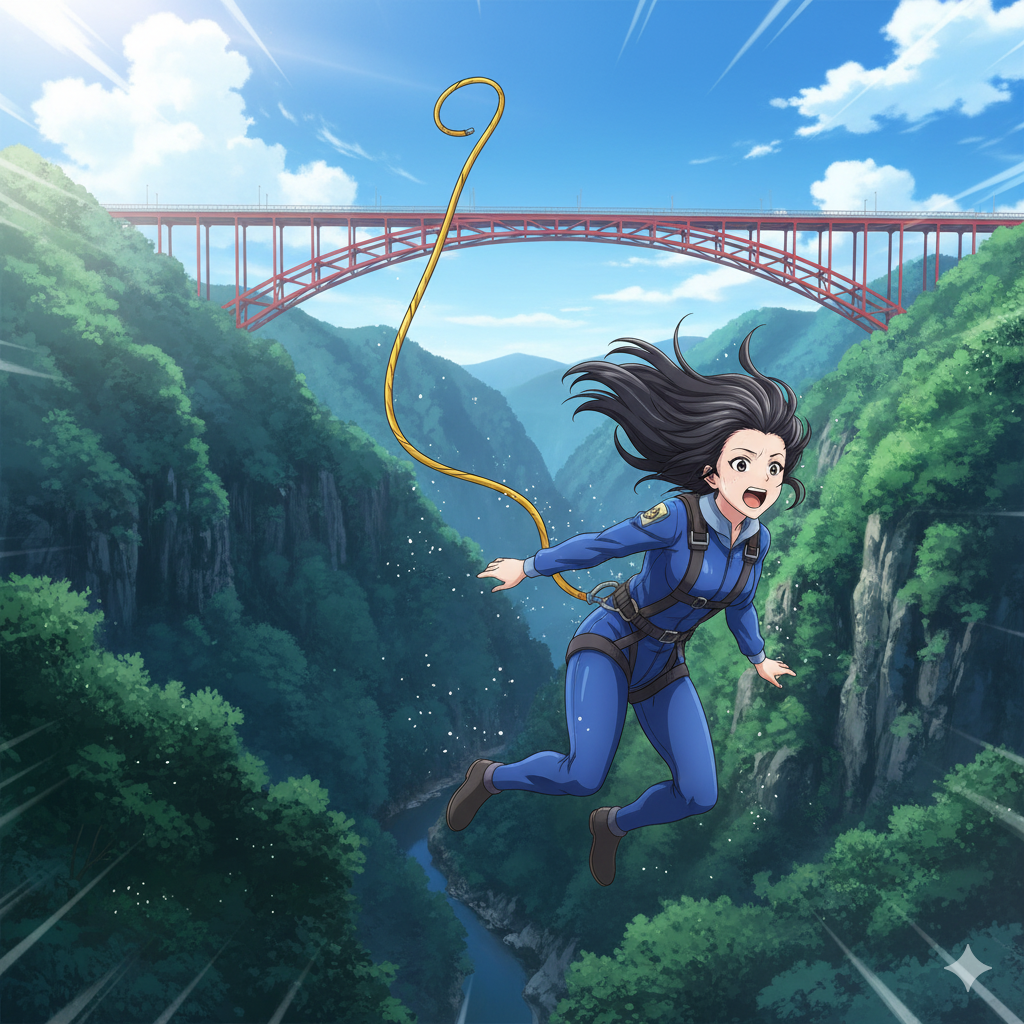 日本人22歳女性が竜神大吊橋でバンジージャンプしている アニメ風