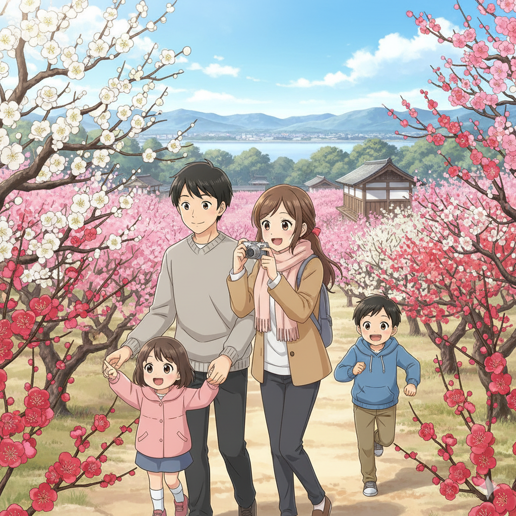 日本人34歳夫婦と娘3歳と息子6歳が偕楽園(水戸の梅まつり)を楽しんでいる アニメ風