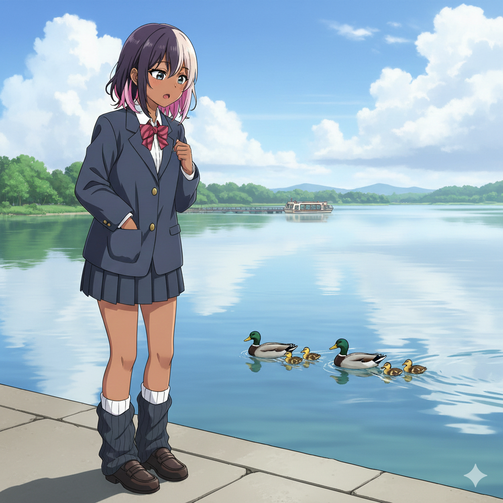 日本人17歳黒ギャル女子高生がルーズソックスを穿いて千波湖のカルガモ親子を眺めている アニメ風